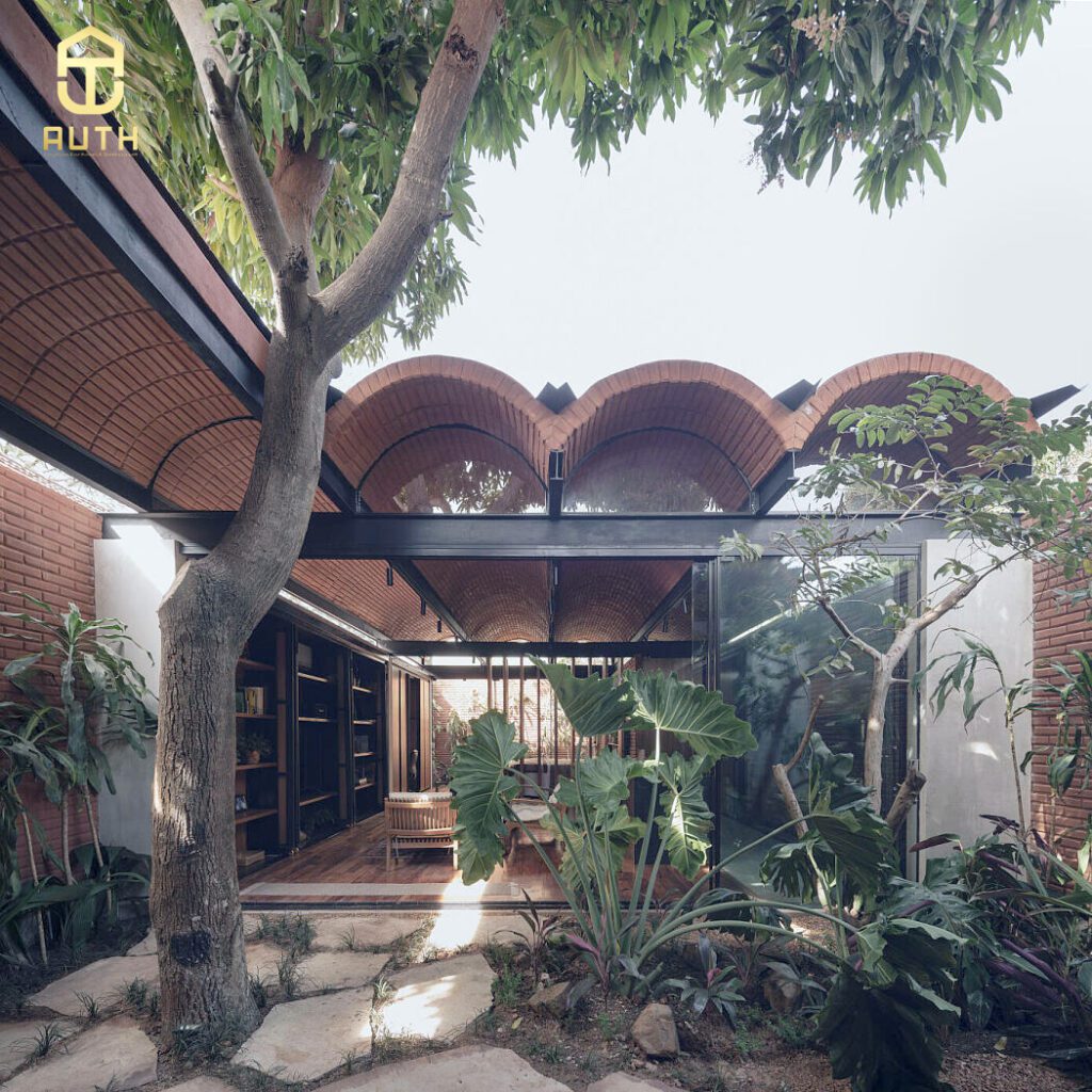 Căn nhà Bungalow mái gạch có diện tích 65 m2 do nhóm kiến trúc sư Auth Corporation thiết kế với những đường vòng cung uốn