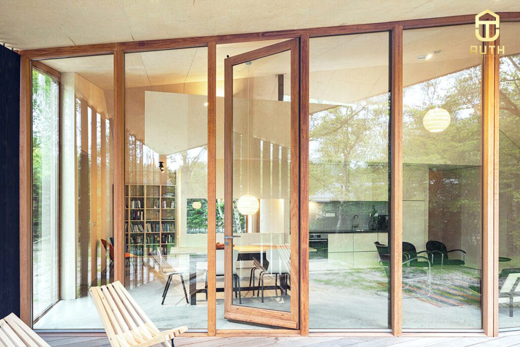 Chất liệu gỗ thô hoàn toàn tạo cảm giác khá ấm cúng, dễ chịu ngay từ cái nhìn đầu tiên. Áp dụng chất liệu kính trên cửa chính với kích thước choán hết chiều rộng, không gian bên trong .
